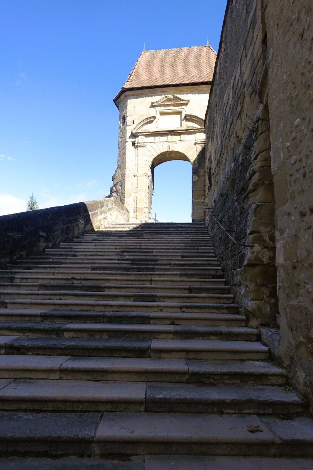 Continuez la visite par le Faubourg ou Bourg du château, qui correspond à l'ancienne combe du château féodal, érigé au XIème siècle, qui marque le début du peuplement à Saint-Antoine ; longez le Gros Mur construit au XVème siècle qui soutient le terre-plein sur lequel repose l'église et son parvis et passez sous la Porte de Lyon ; puis montez les marches du Grand Escalier, datant de 1711, qui était la porte d'entrée des pèlerins vers l'église abbatiale.